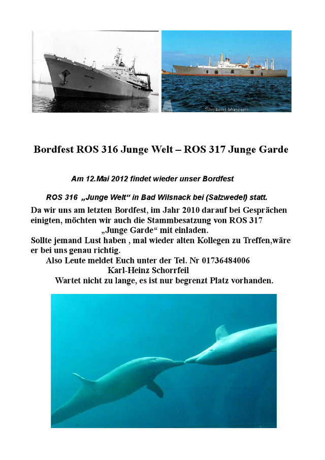 Alle ehemaligen Rostocker und Sassnitzer Hochseefischerinnen und Hochseefischer, alle ehemaligen Betriebsangehörigen des Fiko Rostock sind herzlich eingeladen. Nähere Informationen über unser Programm kommen später.